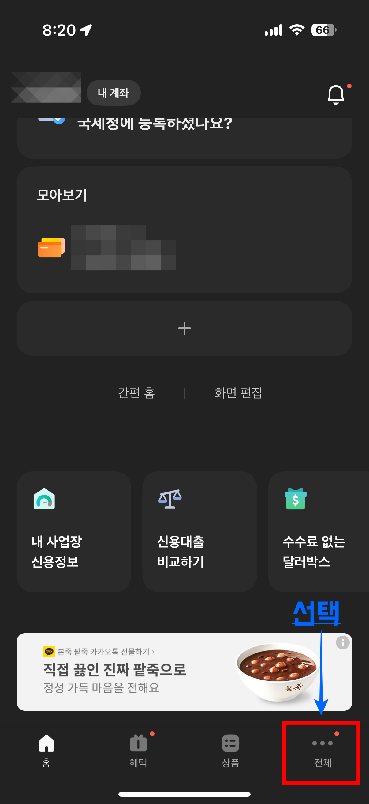 - 스마트폰에 설치된 카카오뱅크를 열어 화면 아래의 점세개를 선택합니다.