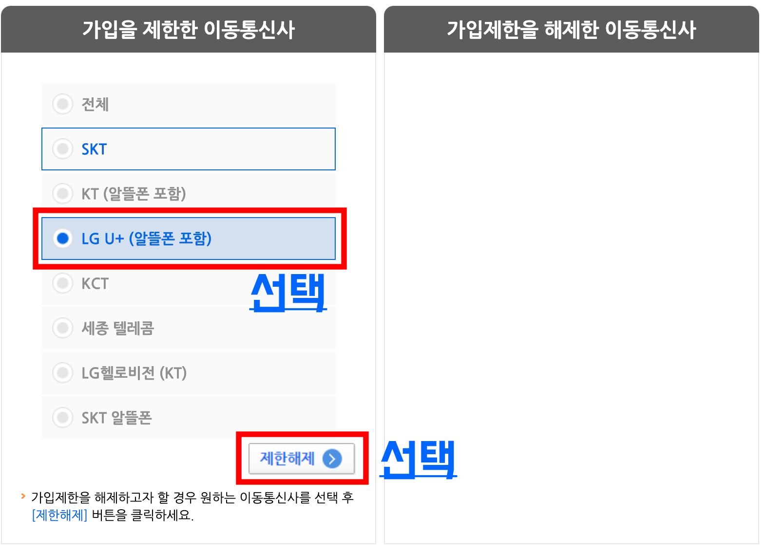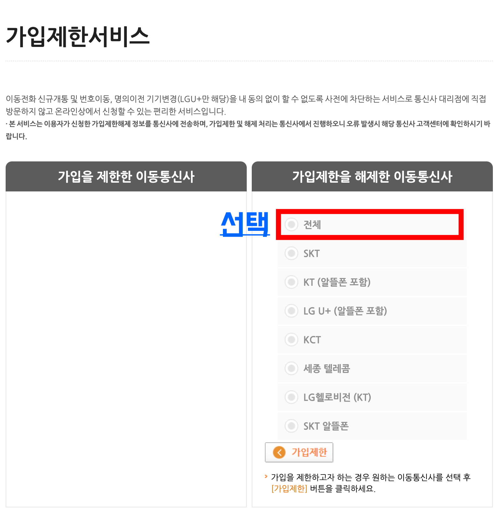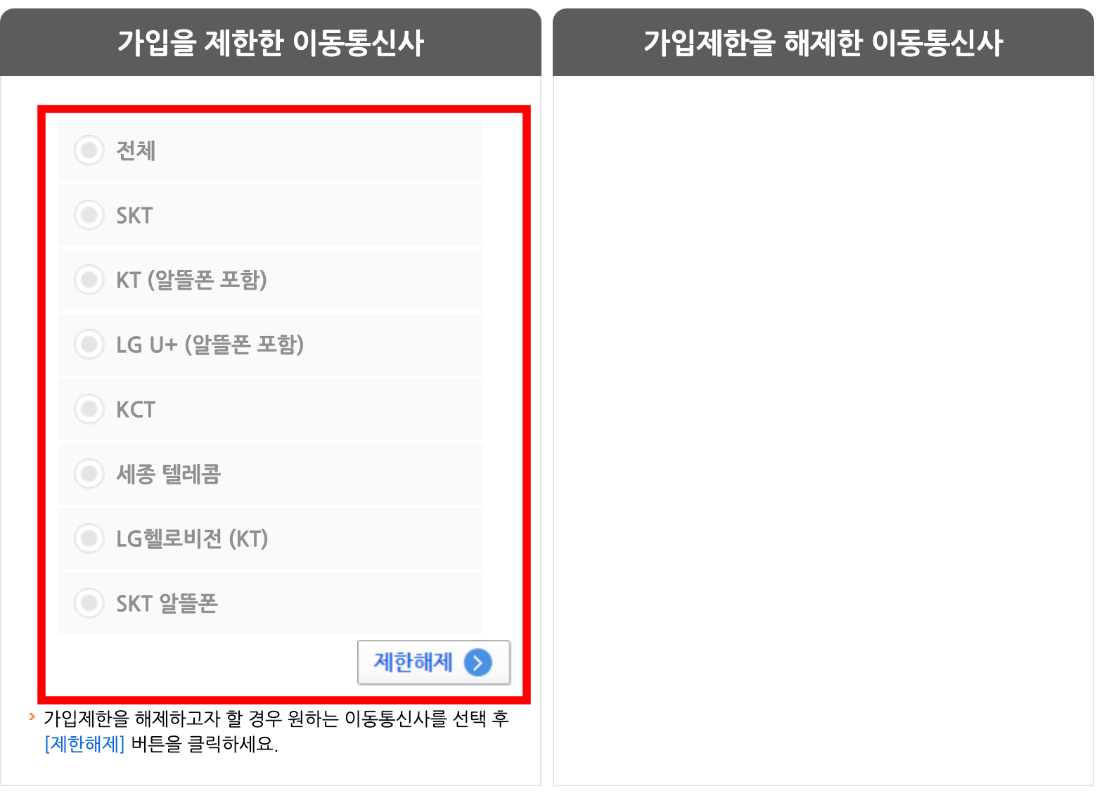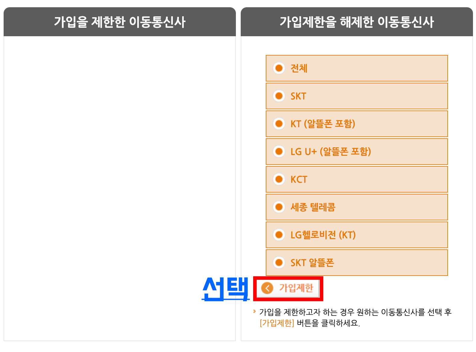 - 가입제한을 할 모든 이동 통신사를 선택하고 아래의 "가입제한" 버튼을 선택하면 가입을 제한한 이동통신사로 모두 이동이 됩니다.