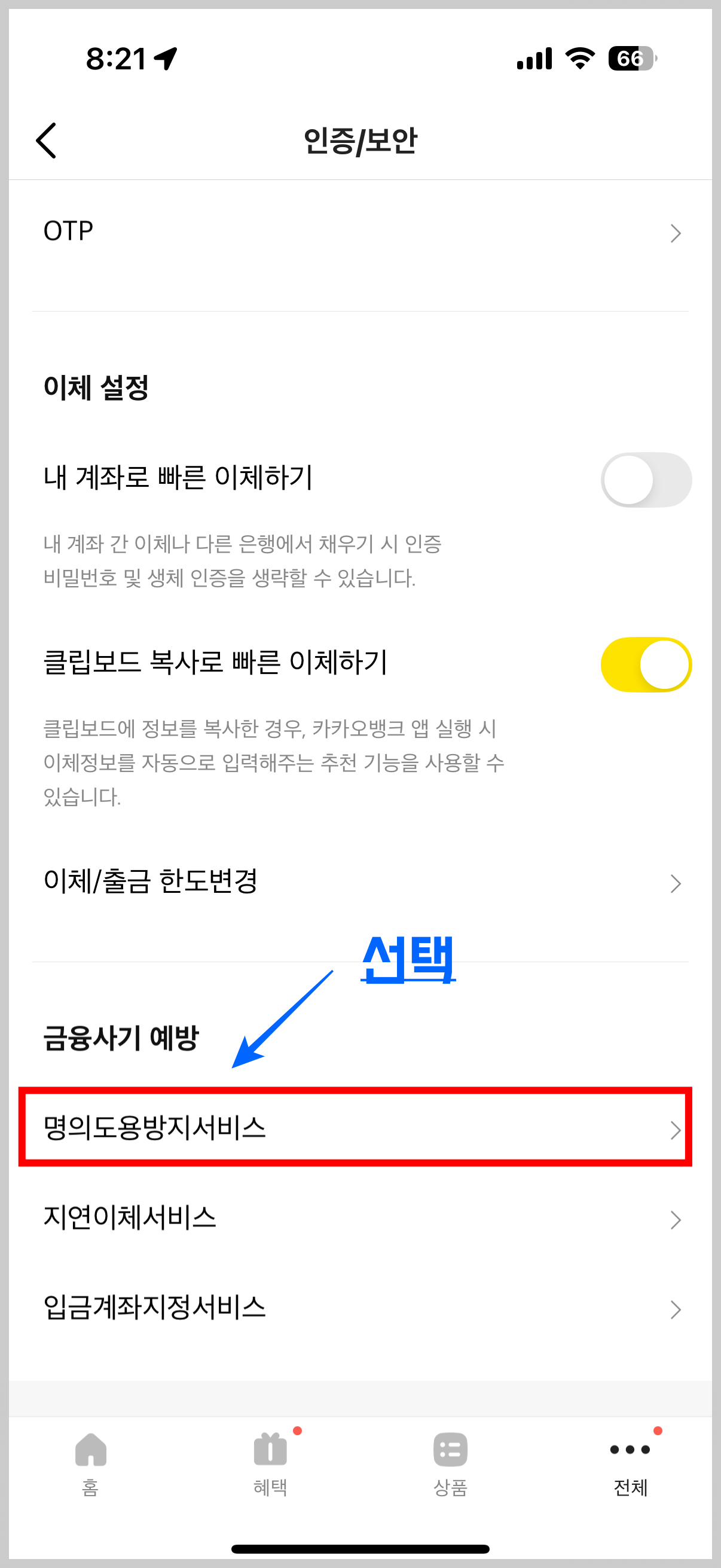 - "인증/보안" 내에 있는 "명의도용방지서비스"를 선택합니다.