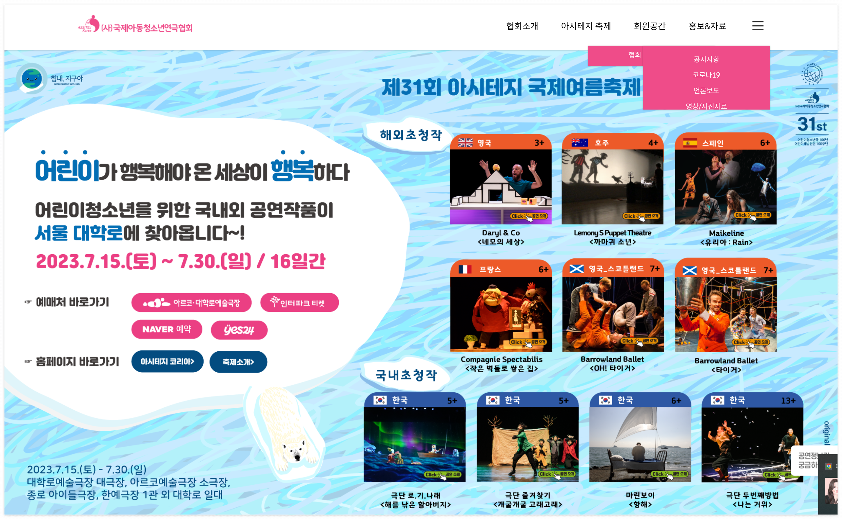 - <2023 아시테지 국제 여름 축제> 7월 15일~7월 30일 까지 대학로 예술극장, 아르코예술극장, 종로어린이 극장에서 열리며 어린이를 휘한 세계적인 공연예술축제로 연극뿐 아니라 무용극, 음악극 등 다양한 장르의 공연과 전시등이 진행됩니다. (서울 종로구 대학로8길 7)
