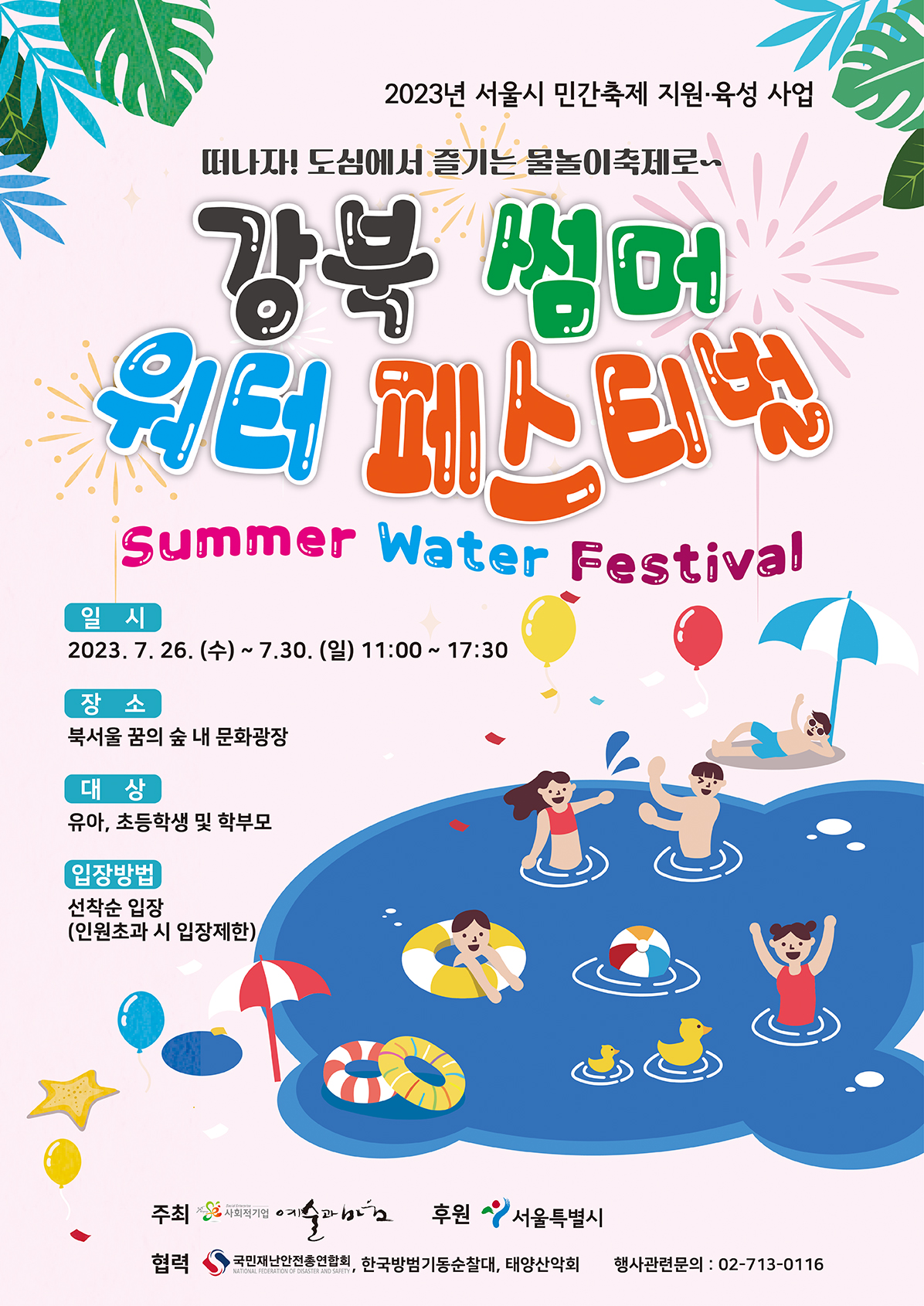 - <2023 강북 썸머 워터 페스티벌> 7월 26일 ~ 7월 30일까지 북서울 꿈의 숲 문화광장에서 어린이 풀장과 타악, 마술, 음악 공연이 개최되며 공원을 찾는 가족들의 여름을 즐겁게 해 줍니다. (서울 강북구 월계로 173)