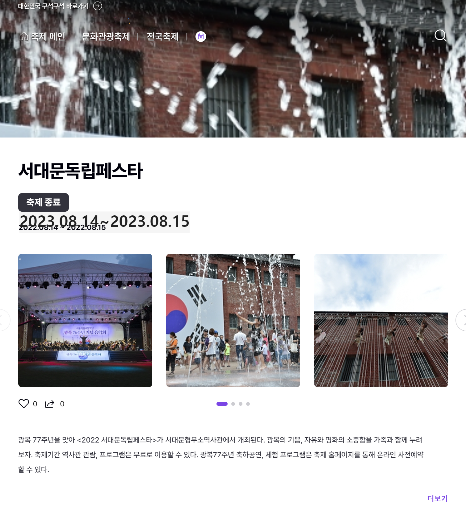 - <서대문 독립페스타> 8월 12일 ~ 8월 15일 서대문형무소역사관에서는 광복의 기쁨을 나누고 독립과 자유, 평화의 가치를 공유하는 역사문화축제로 기념공연, 특별전시, 체험 프로그램 등을 경험할 수 있습니다. (서울 서대문구 통일로 251 서대문형무소역사관)