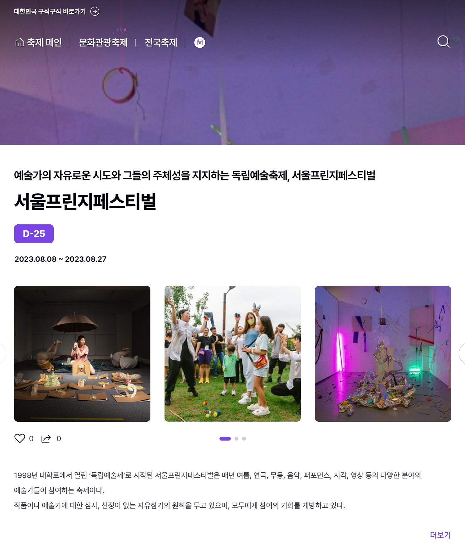 이제 곧 초중고등학교의 여름방학이 시작됩니다. 장마라는 커다란 걸림돌이 있긴 하지만 다양하고 시원한 방법으로 더운 여름방학을 알차게 보낼 수 있는 문화예술축제가 있어 소개하려 합니다. 창작 공연예술축제부터 신나고 시원한 물놀이까지 다양한 축제들이 기다리고 있어 2023년 여름방학을 알차고 시원하게 보낼 수 있습니다. 서울시는 시민들이 축제를 쉽게 찾아가도록 '서울축제지도'를 스마트서울맵 서비스에서도 제공하고 있습니다.