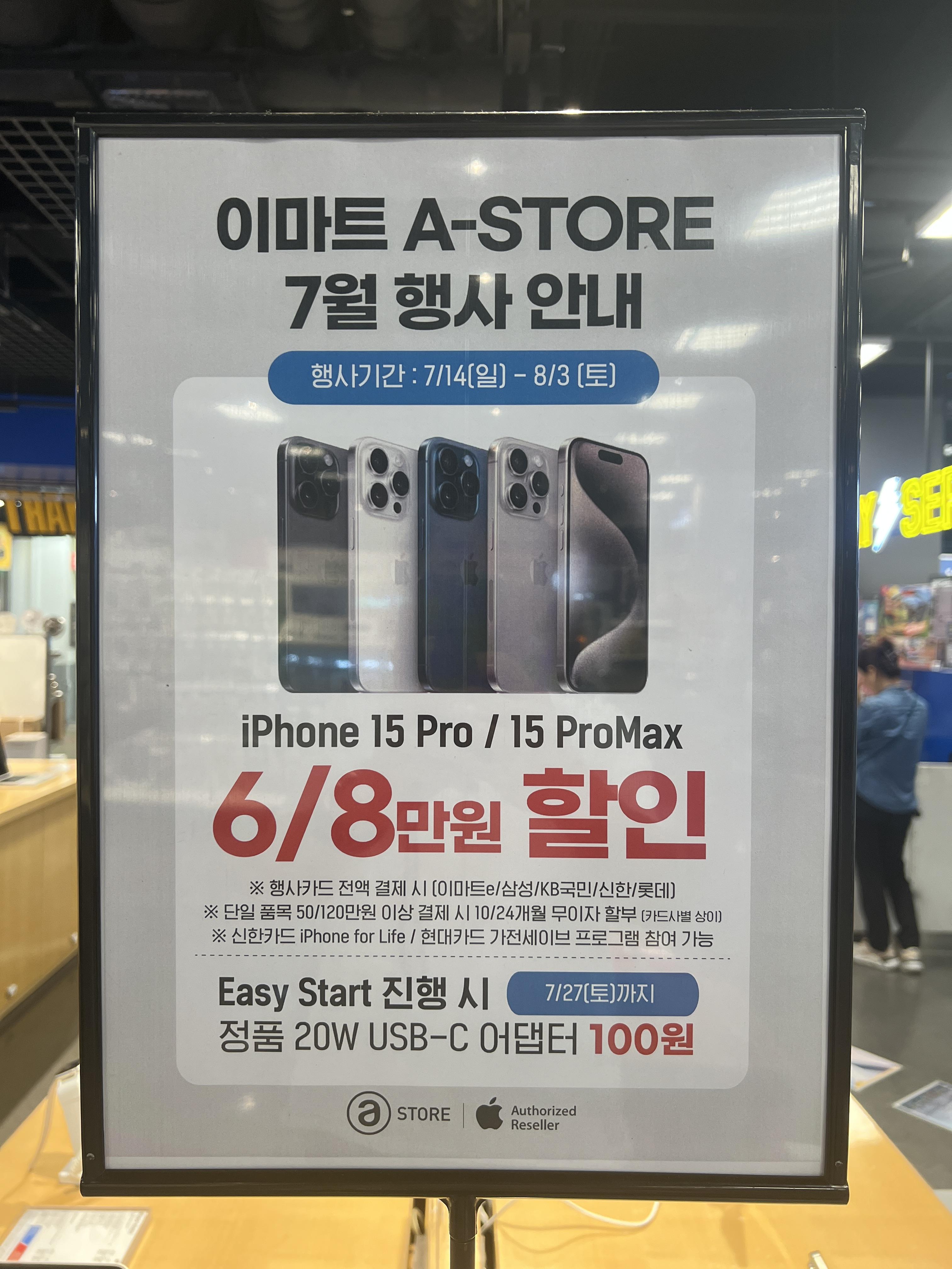 이마트의 에이 스토어에 7월 행사가 열렸습니다. 아이폰 16 시리즈의 출시를 몇달 앞둔 현시점에서 아이폰 15 프로와 15 프로맥스 제품을 할인판매 중에 있습니다. 그동안 아이폰 할인을 기다리셨던 분들에게 반가운 희소식입니다. 내용을 잘 살펴보시기 바랍니다.