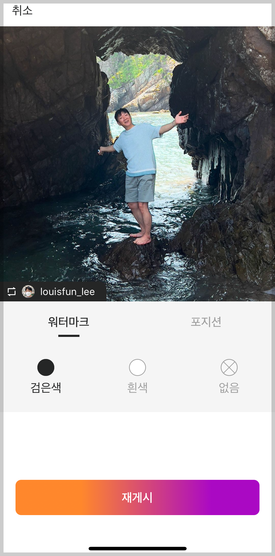6. 리그램을 재게시할 설정을 해줍니다. 워터마크는 원작자의 계정 정보를 넣어줍니다. 워터마크의 위치는 원하는 위치로 조정이 가능합니다. 원하시는 위치에 워터마크를 넣어주세요.