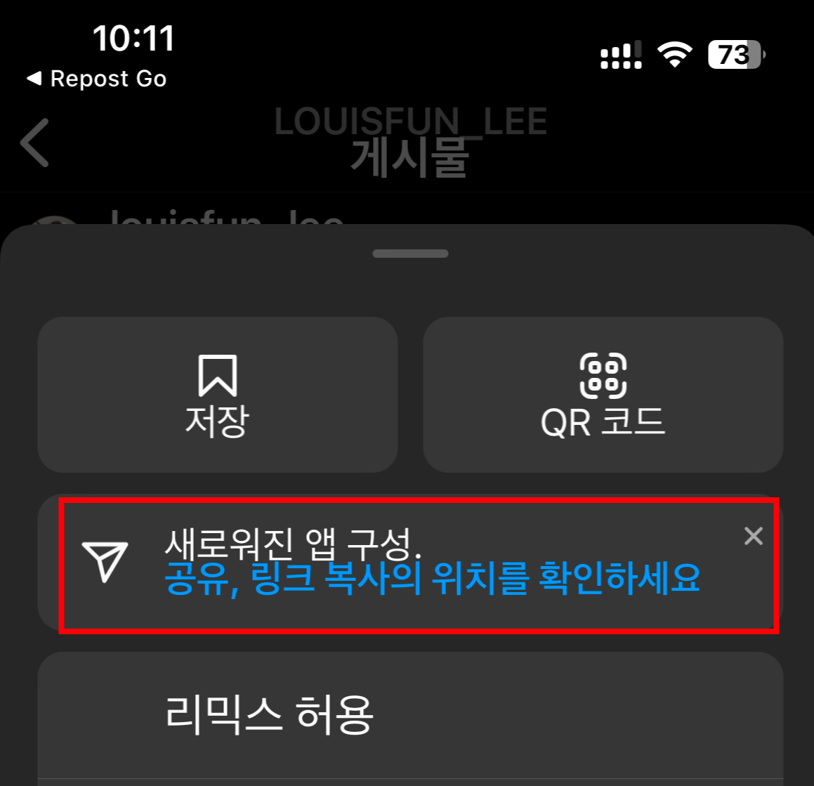 5. 링크 복사가 완료되었으면 설치한 '리포스트 for Insta' 앱으로 돌아옵니다.