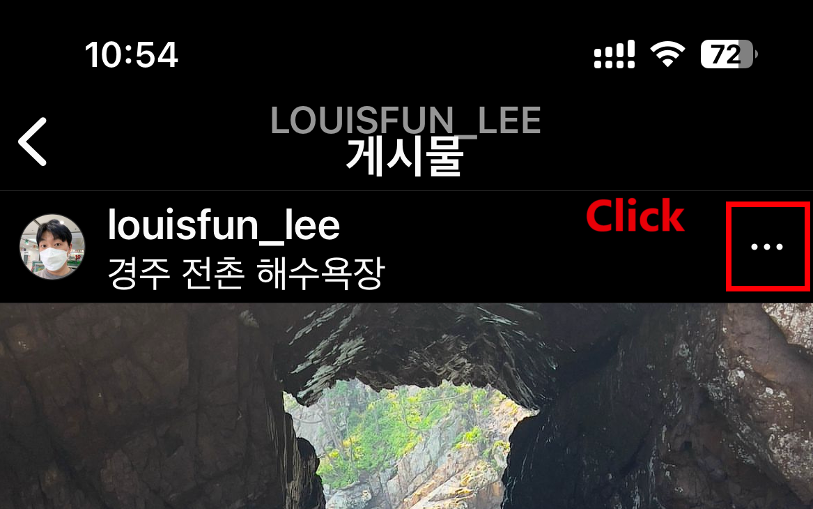 2. 리그램을 원하는 게시물을 선택합니다. 오른쪽 상단의 점 3개를 클릭합니다.