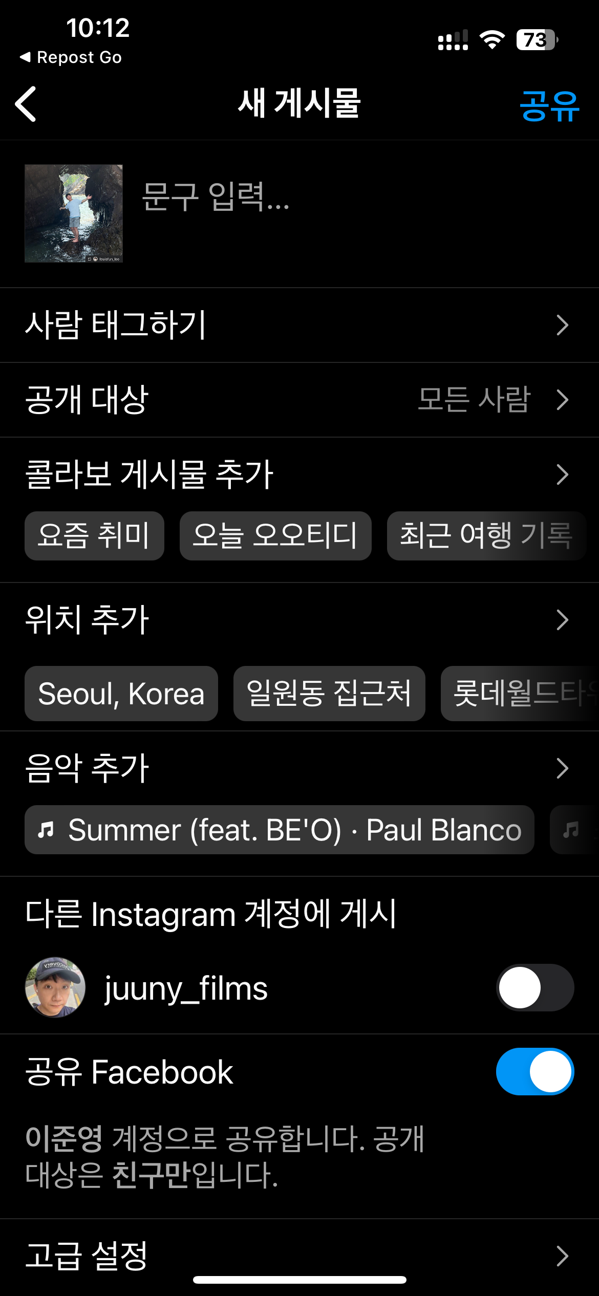 8. 인스타그램의 등록과 매우 유사합니다. 인스타그램에는 없는 추가 내용이 눈에 띄네요. 모든 내용을 입력하여 공유를 클릭하면 인스타그램에 등록되어 게시가 됩니다.