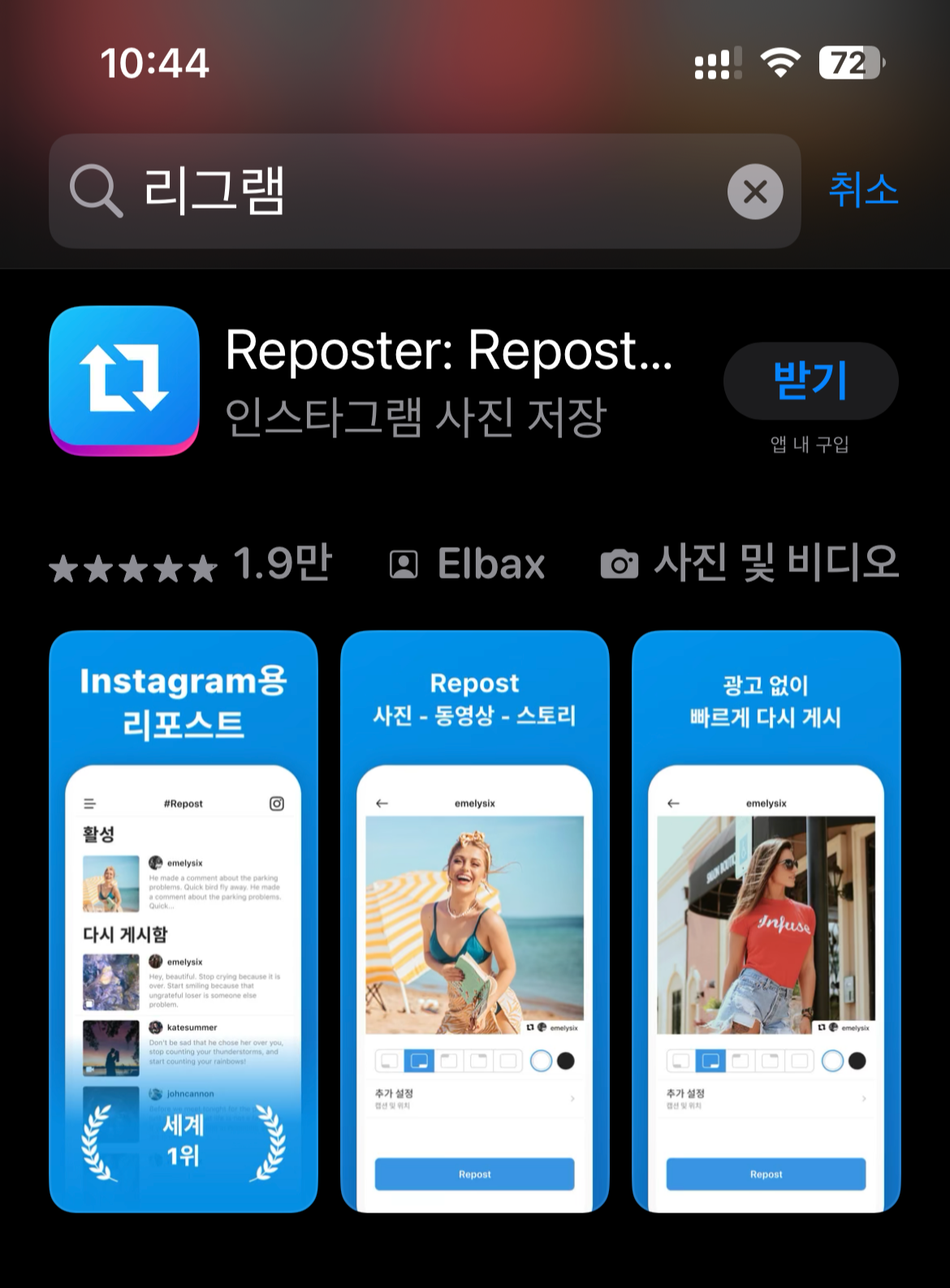 아이폰의 앱스토어나 갤럭시폰의 플레이스토어에 들어가면 리그램 관련 앱이 많이 있습니다. 하지만 리포스트 관련 대부분의 앱이 사용은 편리하지만 유료나 구독을 해야 계속 이용할 수 있는 트라이얼 버전으로 제공하고 있습니다.