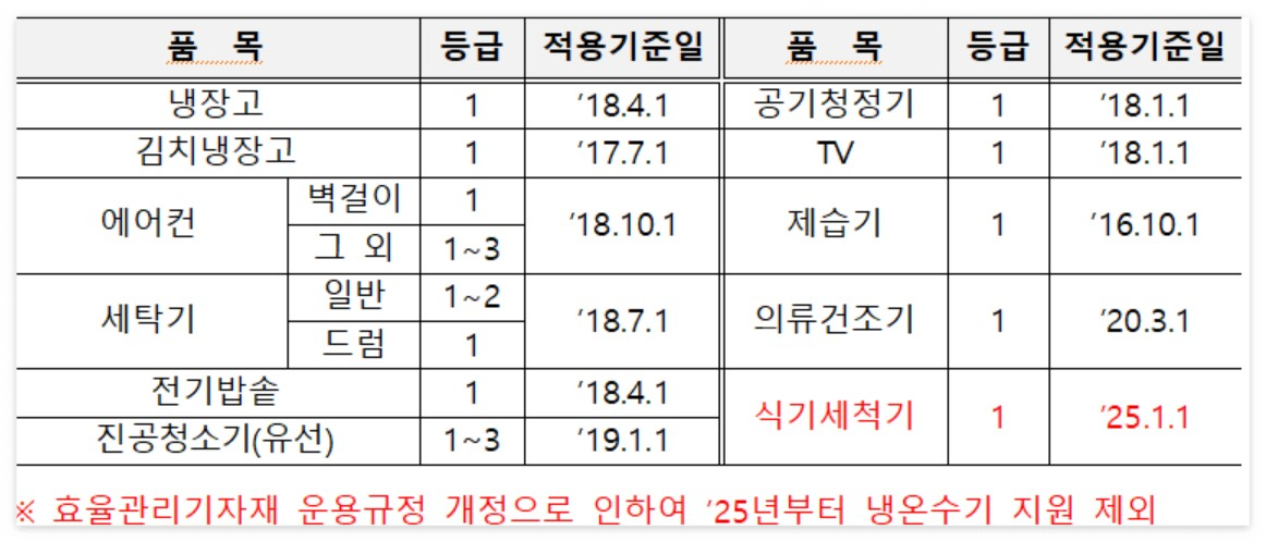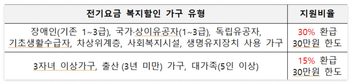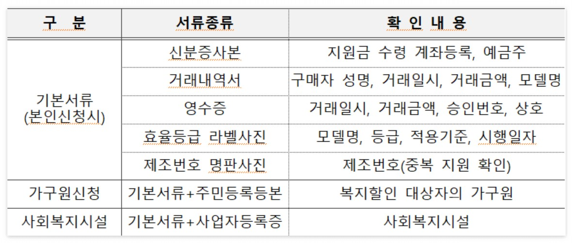 지원대상 : 한전에서 전기요금 복지할인을 받고 있는 가구 중 아래의 지원기기를 구매한 가구