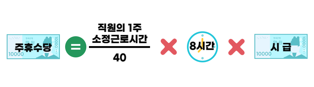 20시간을 법정근로시간 40시간으로 나누면 '0.5'가 나오고 여기에 8시간을 곱하면 '4'가 나옵니다. 여기에 시급을 곱하면 되는데 시급을 10,000원이라 가정하면 총 '40,000'원의 주휴수당이 계산됩니다.