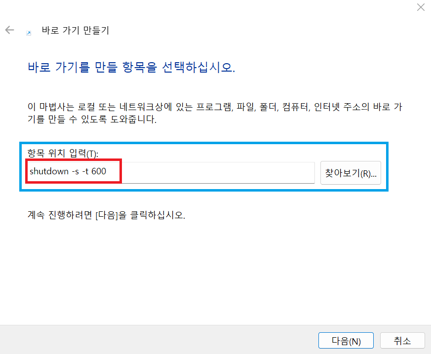 - 항목 위치 입력란에 자동 종료 명령어를 입력하여 줍니다.