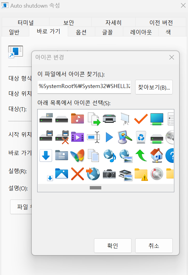 - 윈도우에서 제공하는 기본 아이콘 중에서 원하는 아이콘 선택하시면 끝.