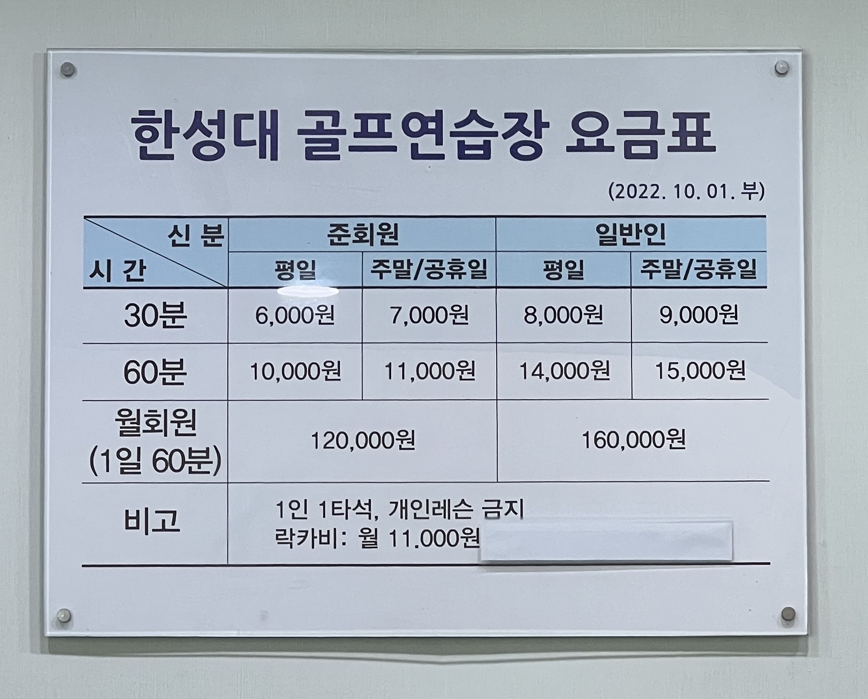 | 타석 일일 요금(정회원, 60분) | 9,000원 |