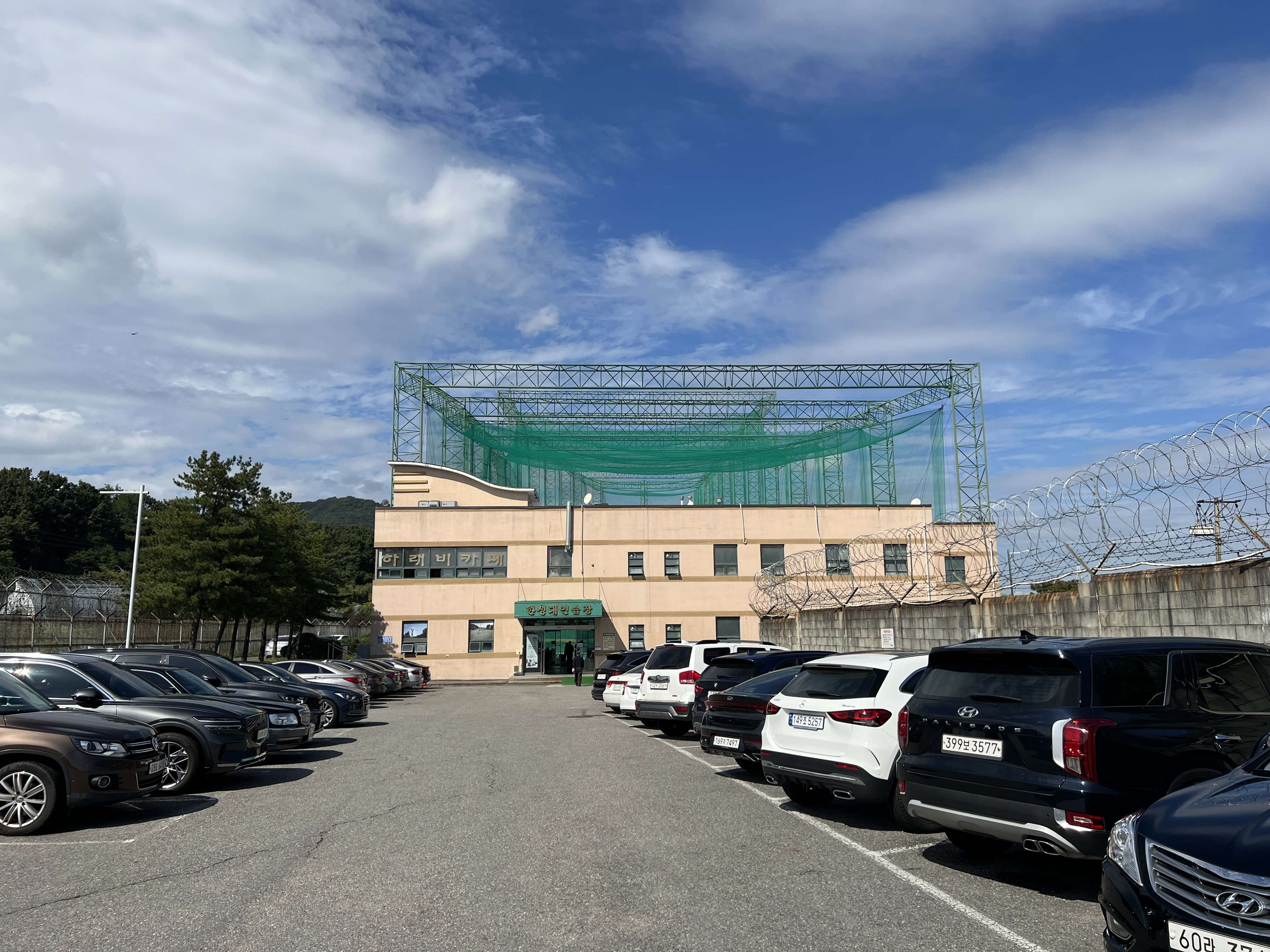 골프 연습장 입구에는 군부대 출입문이 있으니 조심해서 입차하여 주차하시기 바랍니다. 연습장의 주차장이 크지 않아 항상 만석일 때가 많습니다. 하지만 조금 기다리다 보면 바로 자리가 나니 초조해하실 필요는 없습니다.