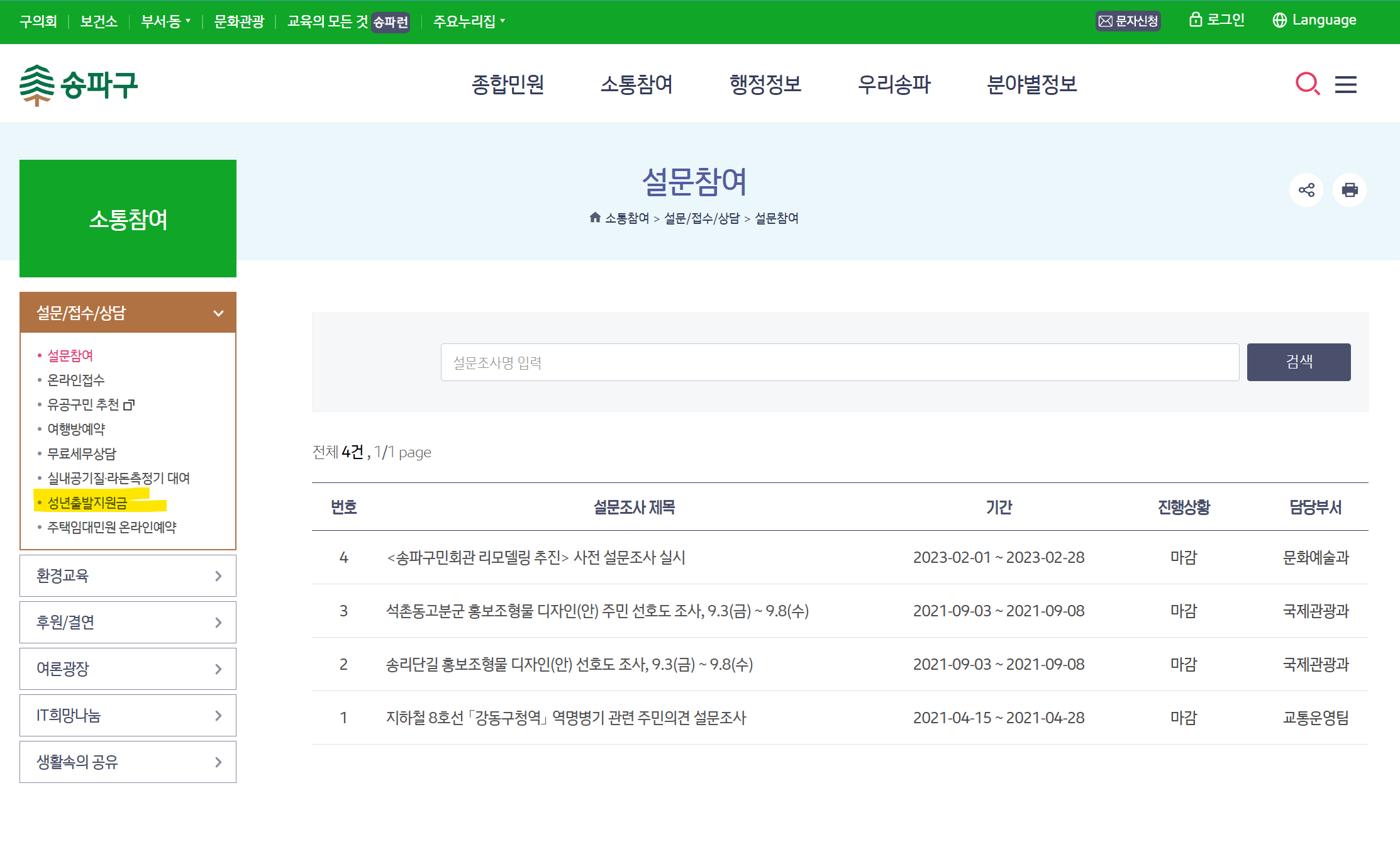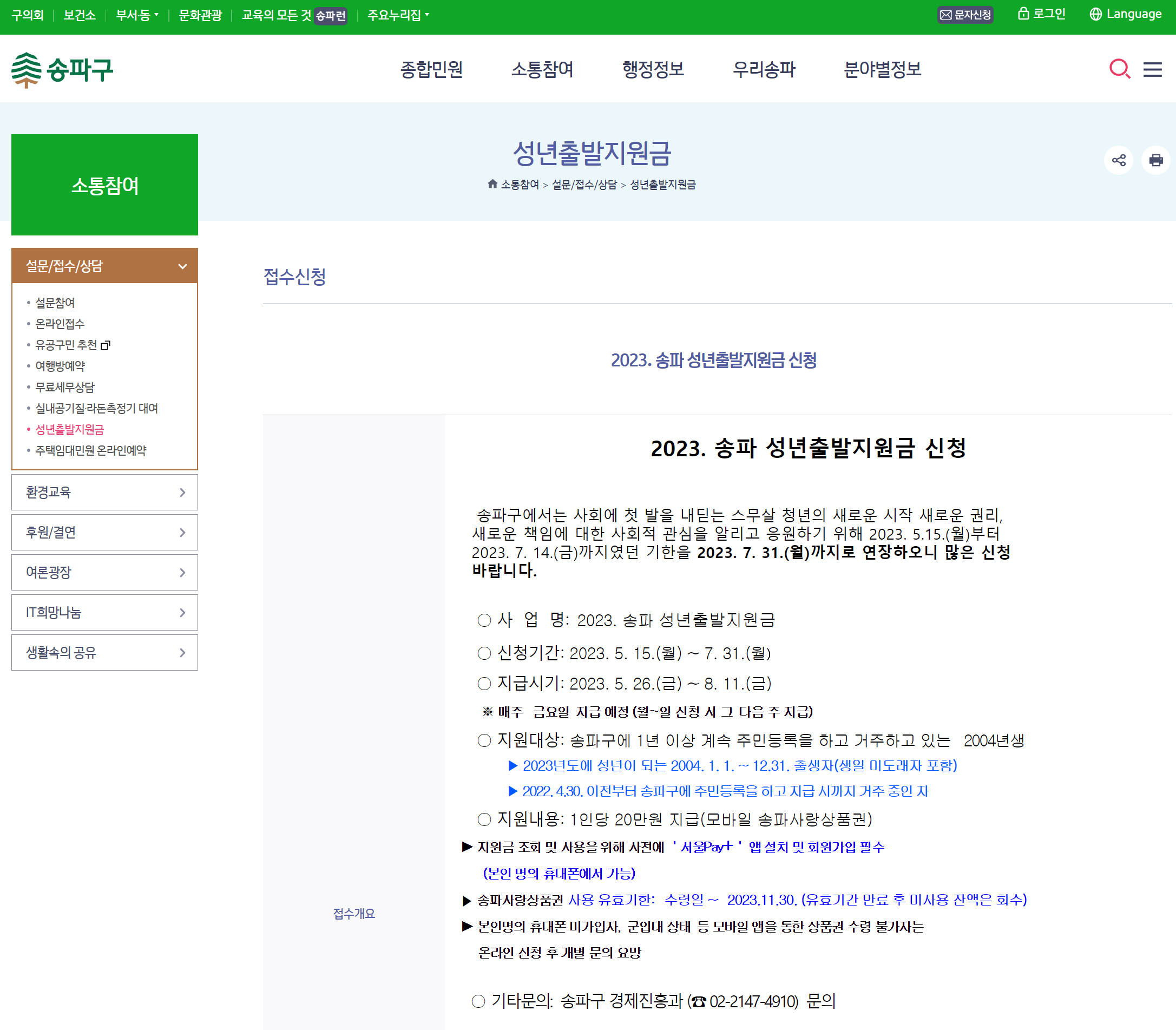 | 메뉴중에서 '소통참여' -> '설문/접수/상담' -> '성년출발지원금' 선택하시면 됩니다. | ![]() |