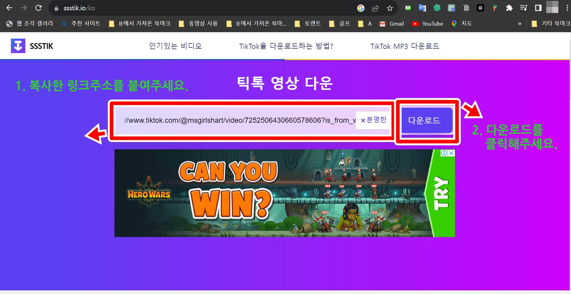 2. 틱톡에서 원하시는 영상의 링크를 복사한 후 다시 ssstik 사이트로 돌아와 링크를 붙이고 다운로드합니다.