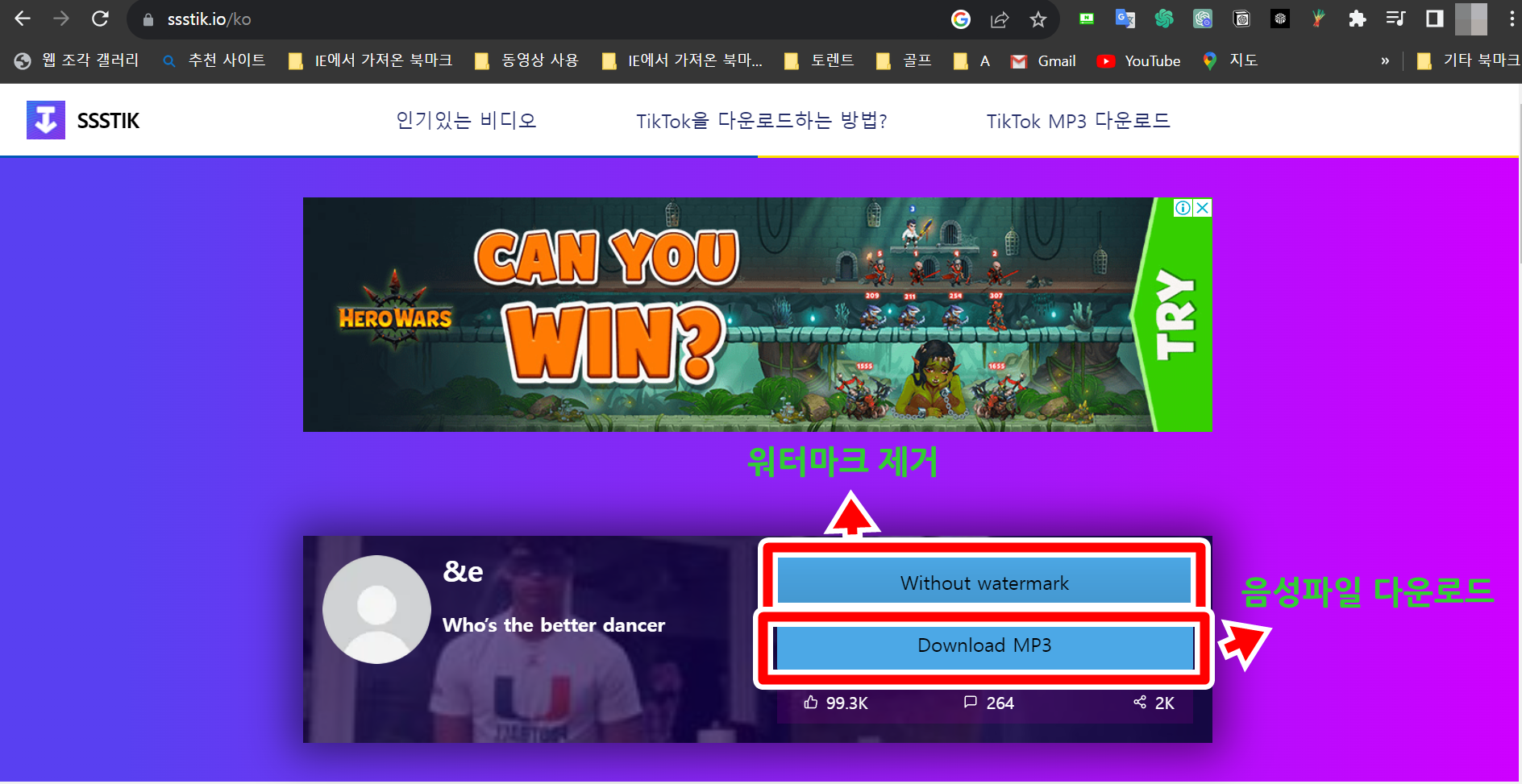 3. ssstik은 영상뿐만 아니라 mp3형식의 음성파일로도 다운로드할 수 있습니다.