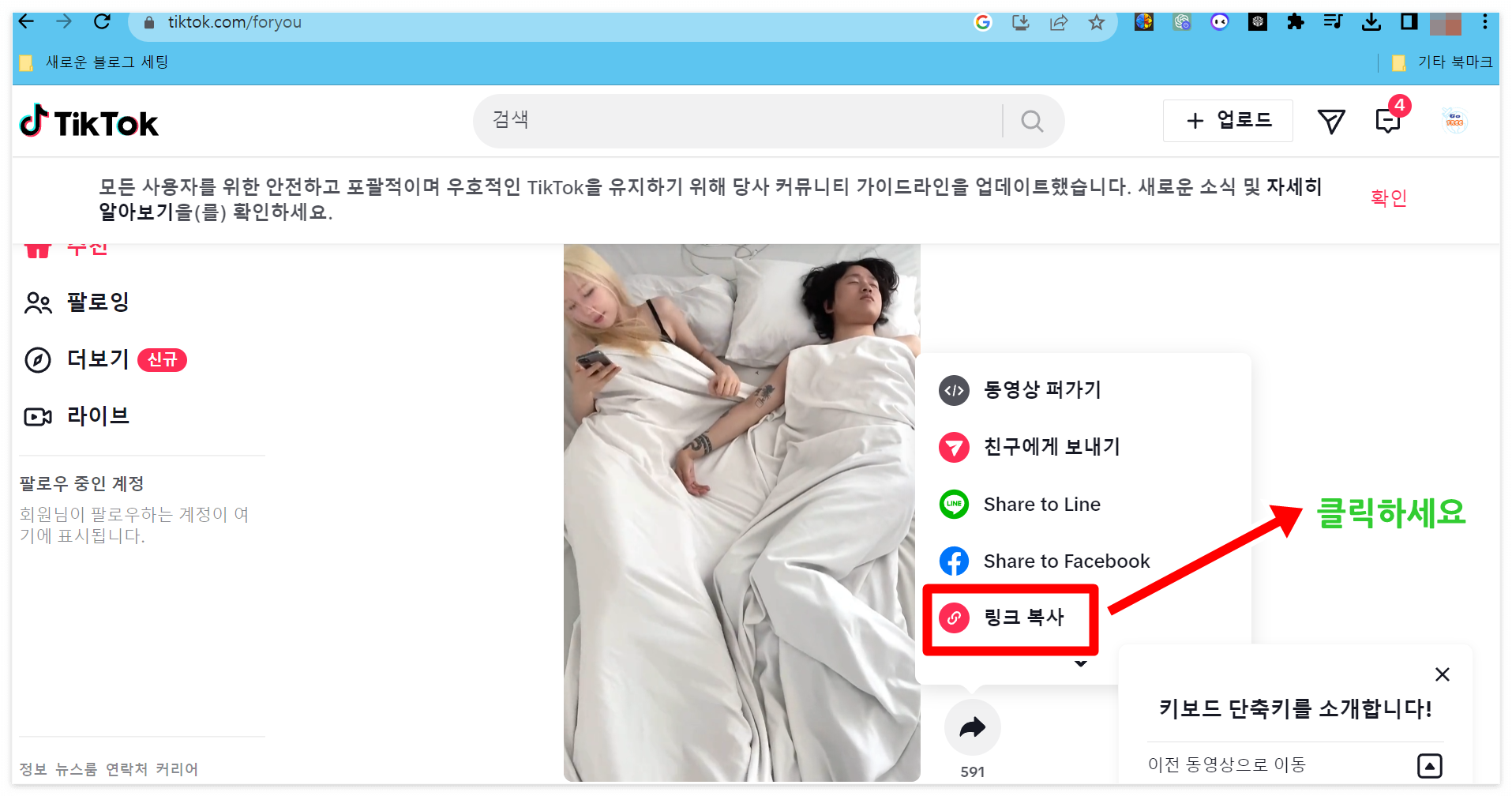 3. 다운로드를 원하시는 영상의 공유 버튼을 눌러 '링크복사'를 해줍니다.